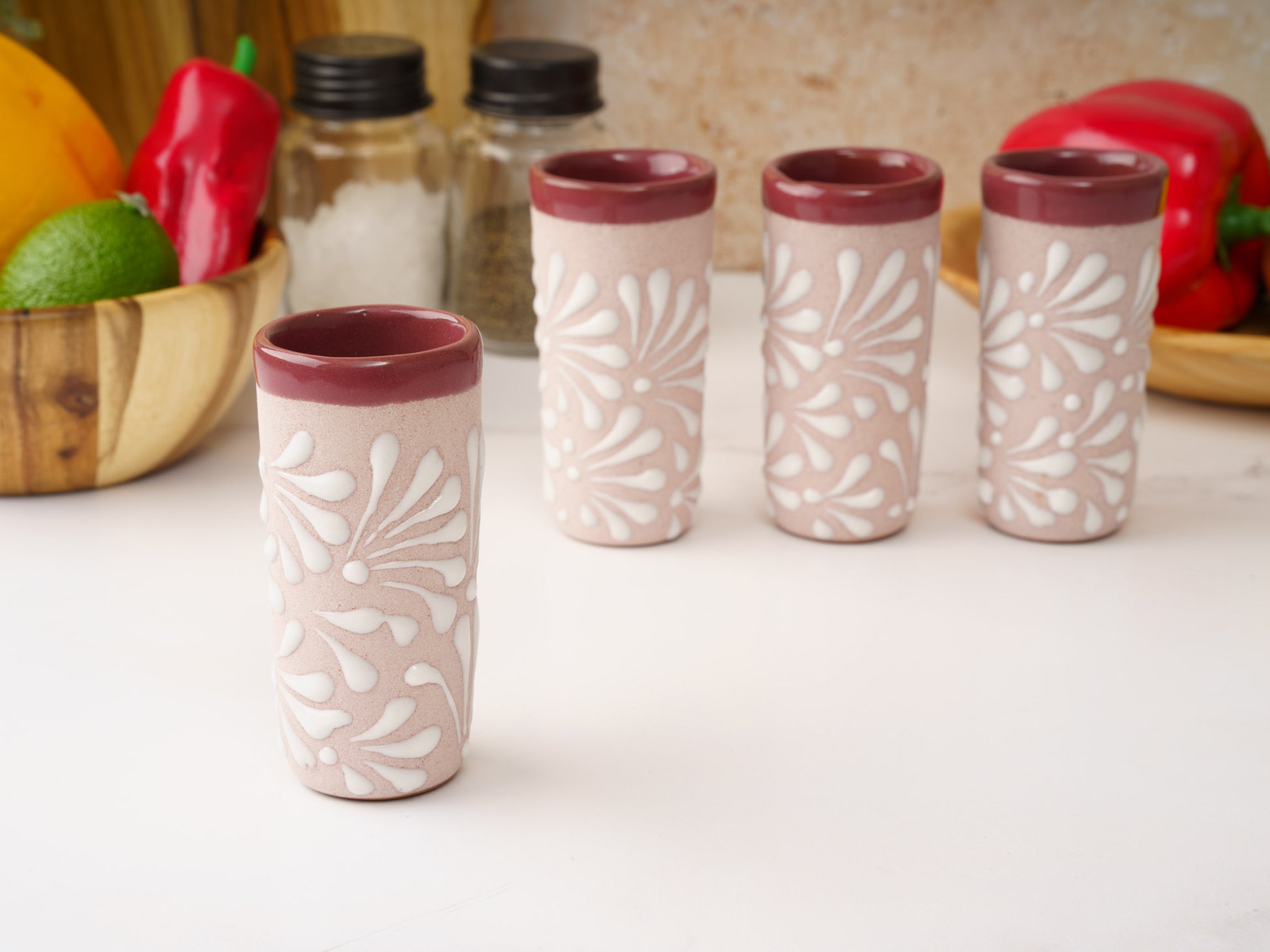 Shot Glass Set (4PC) - Puebla Style - White on Pink